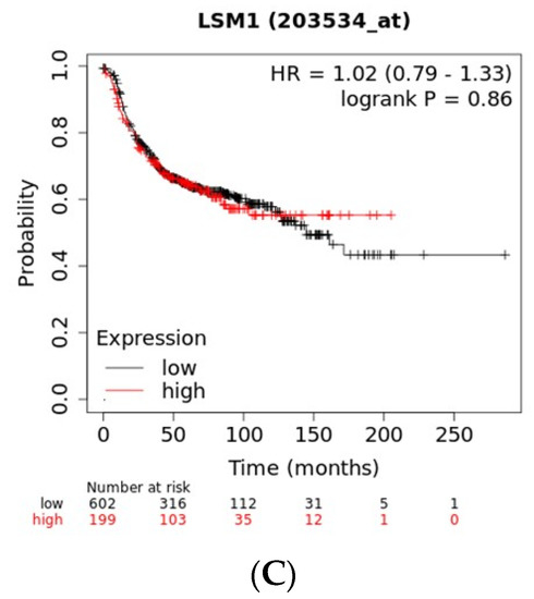Recurrence-free survival in patients with high mRNA expression of LSM1 (the higher quartile of the cohort) compared with patients with lower mRNA expression. (A) Across breast cancer sub-types; (B) in ER positive breast cancers; (C) in ER negative breast cancers.