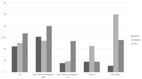 Increased mRNA expression of EIF4EBP1, LSM1 and ZNF703 in samples with amplification of 8p11.23 according to the 3-gene classifier. Percentage of cases with a z score above 2 for each of the 3 genes is shown.