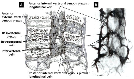 - Groen, R.J.; Groenewegen, H.J.; van Alphen, H.A.; Hoogland, P.V. Morphology of the human internal vertebral venous plexus: A cadaver study after intravenous Araldite CY 221 injection. Anat. Rec. 1997, 249, 285–294. [Google Scholar] [CrossRef]