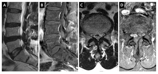 In a prospective, observational study conducted between March 2011 and January 2020, 1815 consecutive patients with pain in the midline or lateralized back, buttock and leg underwent Gd-enhanced T1-weighted MRI with fat suppression, including the coronal, sagittal and axial planes in addition to conventional T1, T2-weighted imaging. The present study is under way to examine the relationships between pain distribution and the enhancement of outer annulus, periannular IVVP and facet capsule. All MR images were obtained with the same platform and equipment (a 1.5 T Achieva scanner, Philips Medical Systems, Bests, The Netherlands) in the same hospital to avoid scanner variations among different vendors and to assess the qualitative measurement of enhancement by using a 16-channel phased-array sensitivity-encoding (SENSE) body coil. Turbo-spine echo (TSE), an applied pulse sequence, was selected on the conventional image without enhancement. Patients were placed in a supine position. To localize most stenotic lesions, images on axial planes were obtained in parallel with each disc space. In contrast-enhanced MRI, a SPIR (spectral presaturation with inversion recovery) sequence was used. Images were obtained in a regular sequence on the axial (repetition time (TR): 400 ms, echo time (TE): 7.4 ms, matrix scan: 256, slice thickness: 4 mm, slice gap: 0.4 mm, field of view (FOV): 220 mm, flip angle (FA): 90°, total scan duration: 3 min 8.8 s), coronal (TR: 400 ms, TE: 7.4 ms, matrix scan: 304, slice thickness: 4 mm, slice gap: 0.4 mm, FOV: 320 mm, FA: 90°, total scan duration: 2 min 20 s) and sagittal (TR: 400 ms, TE: 7.4 ms, matrix scan: 288, slice thickness: 4 mm, slice gap: 0.4 mm, FOV: 320 mm, FA: 90°, total scan duration: 2 min 12.8 s) planes. For the elimination of effect on the time-dependent changes showing contrast enhancement in venous structures within a spinal canal, T1-weighted images were acquired 30 s after intravenous administration of gadolinium-based contrast agents at a dose of 0.1 mmol/kilogram of body weight (gadopentetate dimeglumine, Magnevist®, Schering, Berlin, Germany (2011–2014); gadoterate meglumine, Uniray®, Dongkook Lifescience, Seoul, Korea (2015–2020))