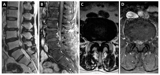 Fat-suppressed T1-weighted magnetic resonance images (MRIs) enhanced with gadolinium (Gd) could show the dilation of microvessels, which is accompanied by inflammatory reactions. This technique could be useful to delineate the venous structure in cases of venous hypertension. Gd could leak through the endothelial fenestration of dilated vessels. The enhanced tissue in the lumbar spinal canal is primarily a venous structure comprising IVVP. The venous plexus can be divided into anterior (the retrocorporeal vein, periradicular or longitudinal vein and intervertebral vein) and posterior (the dorsal epidural or longitudinal vein) IVVP [2,3] (Figure 1). The enhancement of the periradicular or longitudinal vein of the anterior IVVP (PVCE, Figure 2), the dorsal epidural or longitudinal vein of the posterior IVVP (DVCE, Figure 3) and the intraradicular vein of the cauda equina (IRCE, Figure 4) were frequently observed at the site of stenosis. Pain intensity induced by venous congestion could be presumed to increase proportionally depending on the degree of enhancement. Consequently, this technique could be regarded as a functional image representing sites of pain. This study aimed to compare such patterns in clinical situations and to discuss whether these are helpful in symptomatic grading and selection at the surgical level in lumbar spinal stenosis (LSS) patients.