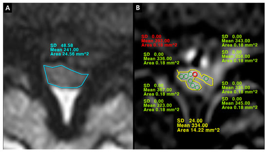 (A) dural cross sectional area (DCSA) on T2-weighted axial image; (B) whole rootlets IRCE (WR-IRCE, yellow color) and maximal spot rootlet IRCE (MS-IRCE, red color) on fat-suppressed enhanced T1-weighted axial image among signal intensities of manually-defined whole rootlets and each rootlet.