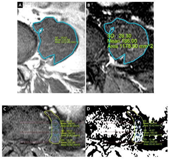 Signal intensity measurement of psoas muscle on fat-suppressed enhanced T1-weighted axial image. (A,B) Psoas1, manually-defined region of interests (ROIs); (C,D) Psoas2, circular ROIs.