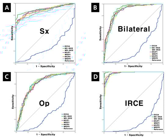 Receiver-operator characteristic (ROC) curves were plotted to produce imaginary cutoff values with high sensitivity and specificity to determine the superiority of enhancement parameters in comparison with DCSA for the prediction of symptom, bilaterality of symptom, visible IRCE and operation. The most predictable parameter in terms of the area under the curve (AUC) was selected. Cutoff values were determined with appropriate sensitivity and specificity.