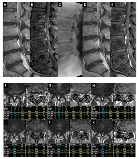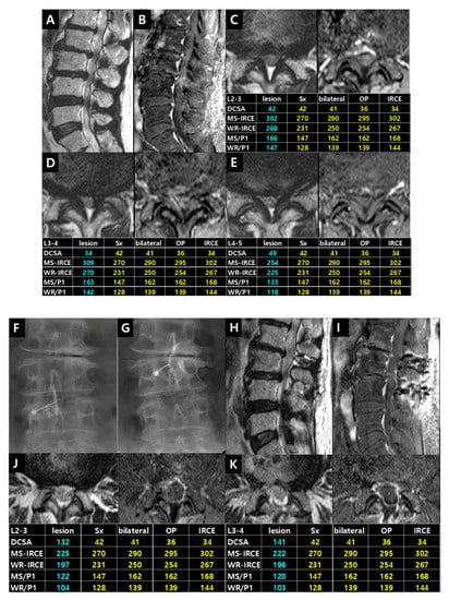 Illustrative Case 3. (A,B) T2-weighted and enhanced fat-suppressed T1-weighted sagittal images showed central stenosis on the L2–3, L3–4 and L4–5 level. Axial images revealed higher signals and enhancement parameters on (C) L2–3 and (D) L3–4 level than (E) L4–5 level. The interlaminar injection was performed on (F) L3–4 level at first. Symptoms improved remarkably; (G) Subsequent injection on L2–3 level also improved the pain. (H,I) After L2 and L3 dome laminoplasties, all symptoms disappeared. One week later, follow-up axial images demonstrated the expansion of the thecal sac and the disappearance of IRCEs on (J) L2–3 and (K) L3–4 level. The decrease of enhancement parameters indicated the immediate improvement after surgery.