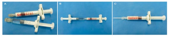 Preparation of CollaStat®. (A) CollaStat consists of two syringes: one for collagen granules and thrombin and the other for CaCl2 solution. (B) CollaStat® can be easily prepared by connecting the two syringes and mixing them. (C) After mixing and detaching the CaCl2 syringe, CollaStat is ready for use by connecting the enclosed application tip.
