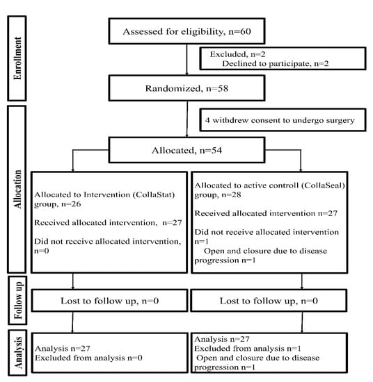 The POPF prevention rate of fibrin sealants has been reported as 88% previously [7]. The non-inferiority limit was calculated to be 0.22 based on the case where more than 75% of 88% of existing treatments were confirmed. When the lower limit of the 95% CI for the difference between the two groups was greater than −0.22, it was judged that TC-matrix was not inferior to T-CD patch. Based on this hypothesis, a sample size of 54 patients (27 in each group) was estimated based on type 1 error α = 0.05 and power (1 − β) = 0.8 using a two-sided χ2 test. Factoring in a 10% dropout rate, we recruited 60 patients (30 per group).