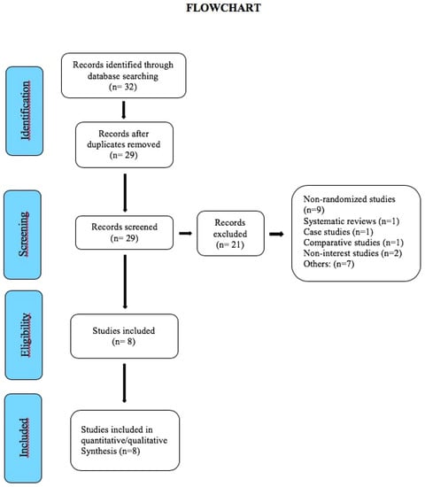 Until November 2019, a total of 32 studies were gathered and subsequently assessed by the reviewers. Three duplicate studies were removed after an initial screening. A second screening, led to the removal of 14 studies, which left a total of 15 studies, and then we removed seven more: two for treating dental phobia through virtual reality exposure therapy (VRET) instead of distraction [8,9], one for being a protocol [20], one for not measuring DA/Pain as output, although DA is used as a predictor [11], two for being half-mouth [21,22], and one for lack of enough data for meta-analysis [23]. This yielded a final sample of eight studies for the analysis (Figure 1, Flowchart): seven in children [24,25,26,27,28,29,30] and one in adults [31]. It should be noted that six studies in children refer to both anxiety and pain [24,25,26,27,29,30], one in children only to anxiety [28], and the study in adults only to pain [31].