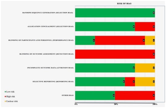 Table 1 provides a general description of the details of each study. The risk of bias (RoB Cochrane Collaboration Tool) in the studies considered is shown in Figure 2. All the studies complied with random sequence. It should be noted that none of the studies included complied with blinding of outcome assessment.