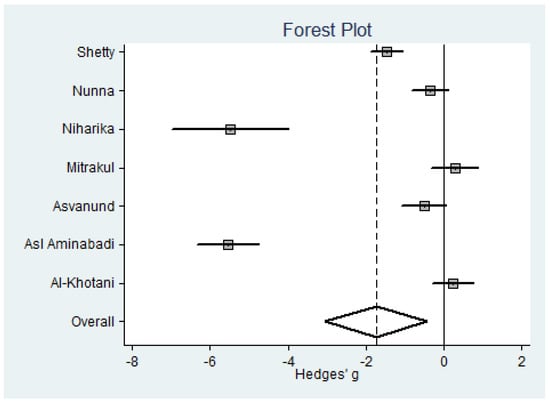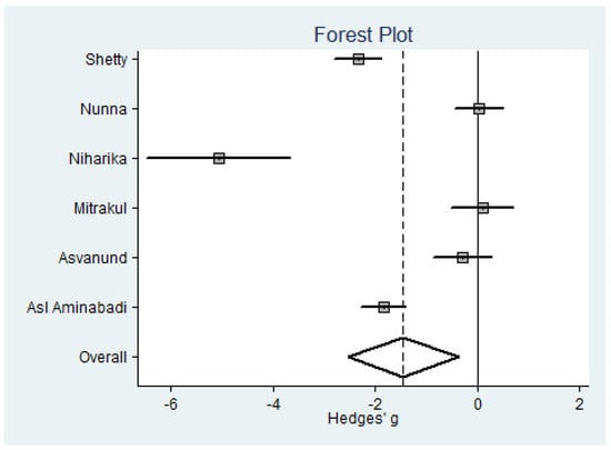 Regarding anxiety, the composite measure (data only for children) is significant, (SMD = −1.75, a substantial effect according to Cohen’s scale [32], p = 0.09) (Figure 3). Heterogeneity seems to be substantial (Table 2).