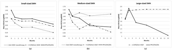 In the subgroup analyses, the small-sized group showed an improved mean BCVA regardless of the treatment modality. In the medium-sized group, anti-VEGF monotherapy had little effect on the visual improvement while the other modalities improved the mean BCVA for 12 months. In the large-sized group, the surgeon excluded anti-VEGF monotherapy. C3F8/anti-VEGF was used in 36.4% and a PPV/tPA/SF6 was employed in 63.6% of patients. The mean BCVA improved only in the PPV/tPA/SF6 group and decreased in the C3F8/anti-VEGF group (Table 3; Figure 1).