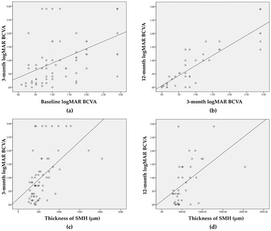 A significant positive correlation was identified between the BCVA at baseline and 3 months (r = 0.543, p < 0.001) and between the BCVA at 3 months and 12 months (r = 0.875, p < 0.001). The SMH thickness also showed a positive correlation with BCVA at 3 months (r = 0.592, p < 0.001) and 12 months (r = 0.497, p = 0.001; Figure 2).