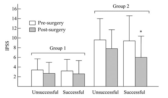 The IPSS is determined by a seven-item self-administered questionnaire, which contains questions concerning urinary symptoms. A higher IPSS score indicates an increased severity of urinary symptoms. Each IPSS question was calculated, and the total scores ranged from 0 to 35 [22].