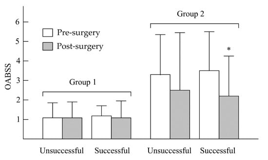 In Figure 1, after UPPP, the unsuccessful and successful surgery subgroups in group 1 showed no significant decreases in IPSS—from 3.42 ± 2.12 to 2.46 ± 2.47 (p > 0.05) and from 3.27 ± 3.01 to 2.68 ± 2.89 (p > 0.05), respectively. In group 2, no significant decreases in IPSS were found in the unsuccessful surgery subgroup (from 9.68 ± 5.33 to 7.79 ± 4.89, p > 0.05), but a significant decrease in IPSS was observed in the successful surgery subgroup (from 9.42 ± 6.76 to 6.46 ± 5.01, p < 0.05). In the unsuccessful and successful surgery subgroups of group 1 (Figure 2), there were no significant decreases in OABSS—from 1.01 ± 0.77 to 1.00 ± 0.82 (p > 0.05) and from 1.14 ± 0.62 to 1.01 ± 0.92 (p > 0.05), respectively. In group 2, the change in OABSS also did not show a significant decrease in the unsuccessful surgery subgroup (from 3.34 ± 2.44 to 2.53 ± 3.12, p > 0.05). A significant decrease in OABSS was found in the successful surgery subgroup (from 3.52 ± 2.33 to 2.12 ± 2.11, p < 0.05). Before undergoing UPPP, AHI had a significant correlation to nocturia frequency among all patients with OSA (r = 0.37, p = 0.001). However, we found that there were no significant correlations between AHI reduction and nocturia frequency after unsuccessful and successful surgery among non-nocturia or nocturia patients (p > 0.05). In non-nocturia patients undergoing unsuccessful and successful surgery, the correlations between AHI reduction and decrease of IPSS or OABSS were not found (p > 0.05). The AHI reduction in nocturia patients undergoing unsuccessful surgery also did not correlate to IPSS and OABSS (p > 0.05), but the nocturia patients undergoing successful surgery had a slight significant correlation with IPSS (r = 0.21, p = 0.04) or OABSS (r = 0.11, p = 0.03).