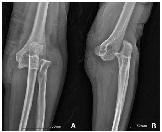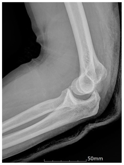 - Abehsera, E.; Guerre, E.; Duriez, P.; El Rafei, M.; Fontaine, C.; Chantelot, C. Ligaments injuries check-up and assessment of their healing potential in simple posterolateral elbow dislocation: About 25 cases. Eur. J. Orthop. Surg. Traumatol. 2019, 29, 785–792. [Google Scholar] [CrossRef] [PubMed]