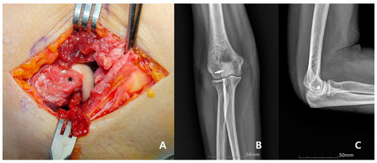 A 59-year old woman treated by repair of LCL alone. Intraoperative photograph reveals that the LCL and common extensor complex had a distractive tear pattern and were retracted from the lateral epicondyle (asterisk) (A). The lateral collateral ligament and common extensor complex are repaired with suture anchors; postoperative anteroposterior (B), and lateral (C) radiograph.