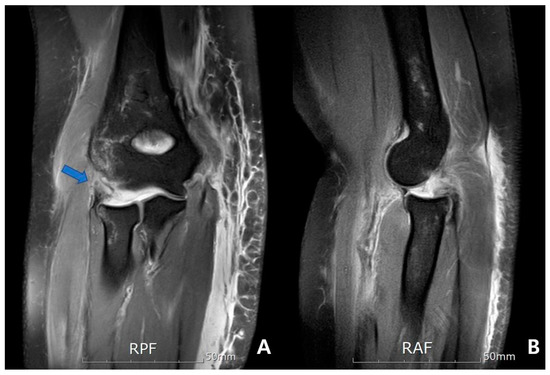 A 59-year old woman injured by a fall from height. Magnetic resonance images reveal stripping-type complete tears of the lateral collateral ligament and common extensor complex (arrow) (A) and a slightly posterior subluxated radial head (B).