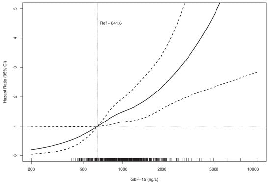 Proportional hazard estimates for all-cause mortality across all ranges of GDF-15 concentrations based on a fully adjusted multivariable model (Model 3 in Table 3) are graphically presented in Figure 1.