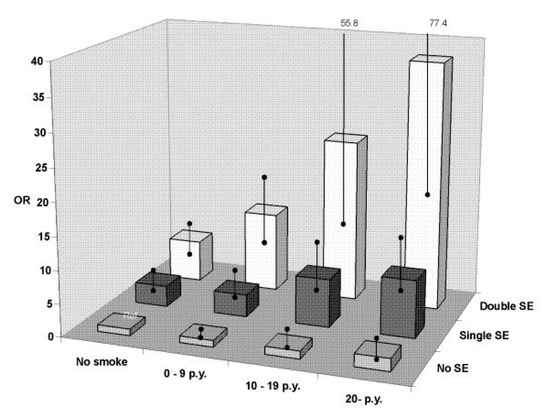 Numerous studies have investigated the interaction between a well-known genetic risk factor (HLA-DRB1 shared epitope (SE)) and smoking on RA development for both antibody positive and antibody negative RA [19,20,21,22,23,24,25]. Smokers carrying two copies of the SE were at a 21-fold increased risk of ACPA-positive RA as compared with non-smokers carrying no SE copy [25]. Moreover, SE- and smoking-related risk of ACPA-positive RA increased with the intensity of smoking and the number of SE alleles (Figure 1) [19]. These results suggest a strong gene–environment interaction with a dose-response effect for both genetic and environmental factors for the risk of ACPA-positive RA.