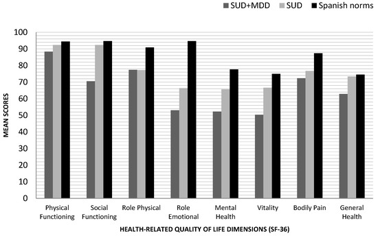 One of the most widely used instruments in mental health to study HRQoL is the Ware-Sherbourne SF-36 survey [37]. The SF-36 reports dimensional data for eight primary scales: Physical Functioning, Role-Physical, Role-Emotional, Social Functioning, Mental Health, General Health, Bodily Pain, and Vitality. It also provides a self-perceived item measuring changes in general health over the last year (Health Change item). This instrument has provided significant data when evaluating HRQoL in patients with SUD [38,39,40], MDD [13,41], as well as with dual pathology [5,42]. It is an instrument that can be used as an indicator of the evolution of the patient with SUD and, in addition, it has been shown to be sensitive to the presence of the diagnosis of MDD, having even suggested that it may be useful as a screening instrument [26,43].