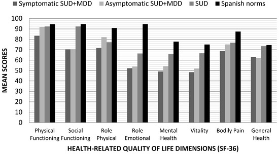 More specifically, if the presence of a comorbid SUD and MDD is analyzed, a special severity is seen in this type of patient. This coexistence of diagnoses is related to more frequent depressive episodes [30] and of greater severity [31], a high risk of suicide [32], a worse prognosis in relation to addiction [33], and significant problems at the socioeconomic level [34]. For all these reasons, the study of the characteristics of patients with dual depression (SUD + MDD) and their HRQoL is of special interest, since it can provide valuable data on their adherence to treatment, prognosis and/or recovery [3,9,35,36]. The exploration of the influence of SUD vs. SUD + MDD on HRQoL is also of great interest due to its theoretical and clinical implications, since it could provide data on which HRQoL dimensions are especially affected by each of these conditions.