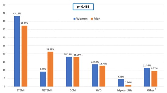 With respect to in-hospital mortality, no significant differences were observed according to gender (47.83% in women and 52.73% in men, p = 0.693). Moreover, cardiovascular causes represented over 90% of the total number of deaths in AMI-related cases (p = 0.837) (Table S3).