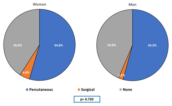 Seventy-five (54.35%) patients included in the study underwent percutaneous revascularization, whereas four (2.90%) were treated surgically, without any significant differences between both groups (Figure 2). A total of 16.67% of women and 15.56% of men persisted with thrombolysis in myocardial infarction (TIMI) coronary flow grade 2 or worse after revascularization (p = 0.904).