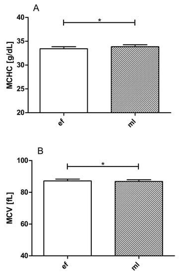 | MCH [pg] | 29.14 ± 0.39 | 29.36 ± 0.39 | 29.39 ± 0.42 | 0.038 | |