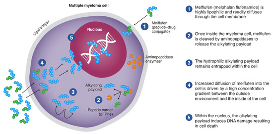 Melphalan flufenamide (melflufen) is a first-in-class peptide–drug conjugate (PDC) that targets aminopeptidases and rapidly releases alkylating agents into tumor cells [28,29,30,31,32]. Because of its distinct mechanism of action, melflufen is well suited for use in third-line therapy both in patients who have not received prior alkylator therapy, such as older patients and those who are not eligible for transplant, as well as in patients who have prior exposure to melphalan [29]. This review describes the historical development of melflufen, its mechanism of action, and the ongoing clinical development program for melflufen in multiple myeloma.