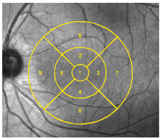 In macular cube OCT scans, the thickness of the complete retina (from internal limiting membrane to retinal pigment epithelium) was estimated at the nine subfields of the Early Treatment Diabetic Retinopathy Study (ETDRS) (Figure 1).