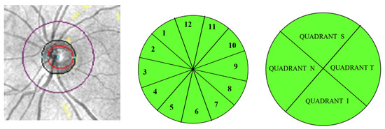 In optic nerve cube OCT scans, the thickness of the peripapillary retinal nerve fiber layer was measured in 12 clock-hour sectors and 4 quadrants (Figure 2).