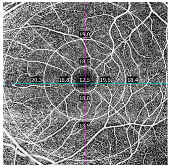 In macular OCTA, two vascular indices were automatically obtained using ETDRS grid (Figure 1): Vessel density (VD) and perfusion density (PD). VD is characterized as the absolute length of the perfused vasculature per area in a considered region of estimation. Its units are mm/mm2 ranging from 0 (no vessels) to an unbounded maximum (Figure 3). VD can be thought of as unwinding all the vasculature in a considered area, estimating its length with a ruler, then dividing the result by the involved area [22].
