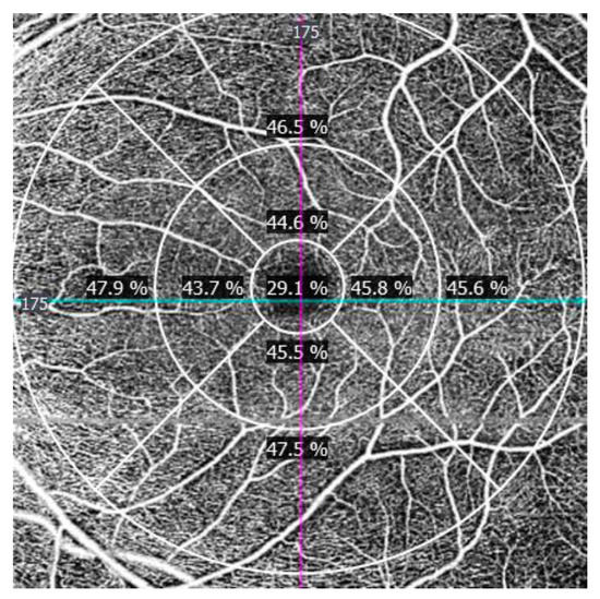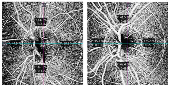 In peripapillary OCTA, two vascular indices were also automatically obtained considering four quadrants (Figure 5) and measuring from internal limiting membrane to the retinal nerve fiber layer: peripapillary perfusion density (pPD) and flux index (FI). The pPD is defined, similarly to PD in the macula, as the total area of perfused vasculature per unit area in a region of interest, expressed in percentage. FI is defined as the total area of perfused vasculature per unit area in a considered region, weighted by the brightness (intensity) of the flow signal. FI quantifies the number of blood cells passing through a retinal vessel cross-sectional area per unit of time. It is a unitless parameter [22,23].