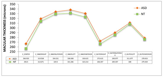 Retinal thickness of the nine subfields of the macular ETDRS grid. ASD = autism spectrum disorder group; NT = neurotypical group. Values represent mean thickness in microns for each group. No significant differences were detected between groups (Mann–Whitney U test).