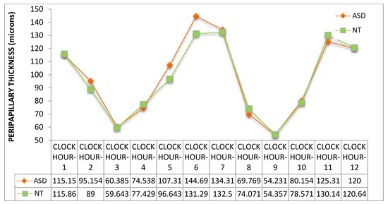 Peripapillary retinal nerve fiber layer thickness of the 12 clock-hour sectors. ASD = autism spectrum disorder group; NT = neurotypical group. Values represent mean thickness in microns for each group. No significant differences were detected between groups (Mann–Whitney U test).