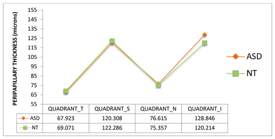 Peripapillary retinal nerve fiber layer thickness of the 4 quadrants. ASD = autism spectrum disorder group; NT = neurotypical group. Values represent mean thickness in microns for each group. No significant differences were detected between groups (Mann–Whitney U test). T = temporal, S = superior, N = nasal, I = inferior.