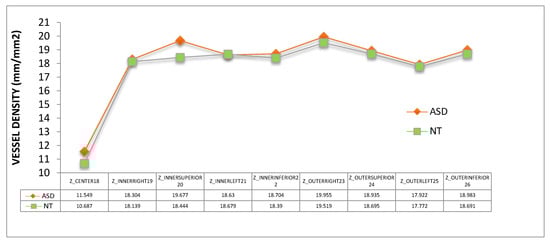 Vessel density of the nine subfields of the macular ETDRS grid. ASD = autism spectrum disorder group; NT = neurotypical group. Mean values were indicated for each group. No significant differences were detected between groups (Mann–Whitney U test).