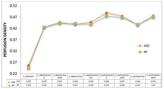 Vessel density (Figure 9) and perfusion density (Figure 10) in the macula of the ASD group also showed a tendency to be higher than those of NT group. All these differences were not statistically significant (p > 0.05).