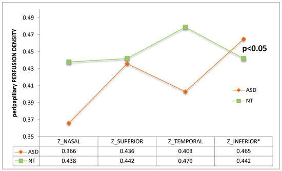 Perfusion density of the 4 peripapillary quadrants. ASD = autism spectrum disorder group; NT = neurotypical group. Mean values were indicated for each group. * Note that the difference between inferior values is statistically significant (p = 0.029, Mann–Whitney U test). T = temporal, S = superior, N = nasal, I = inferior.