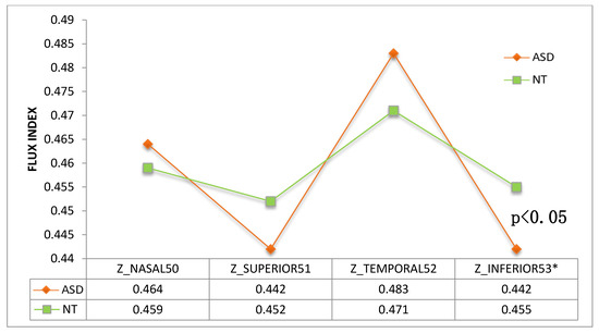 Flux index of the 4 peripapillary quadrants. ASD = autism spectrum disorder group; NT = neurotypical group. Mean values were indicated for each group. * Note that the difference between inferior values is statistically significant (p = 0.037, Mann–Whitney U test).