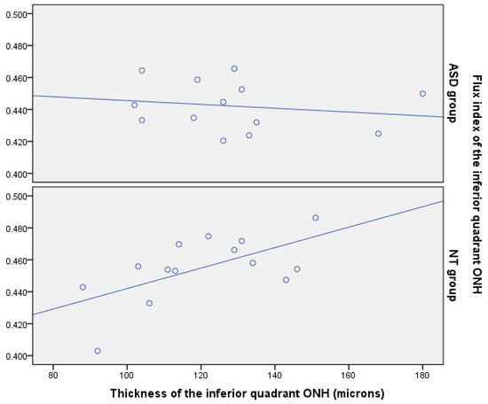 Scatterplots representing the association between peripapillary retinal nerve fiber layer (RNFL) thickness and flux index at the inferior peripapillary quadrant in autism spectrum disorder (ASD) group and neurotypical group (NT). Each point represents the left eye value of each patient. ONH = optic nerve head. Best correlation lines have been added.