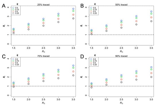 The effective reproduction number, given different effectiveness of contact tracing among symptomatic cases and the basic reproduction number (). The probability of a major epidemic was estimated with different effectiveness levels of contact tracing (25% (), 50% (), 75% () and 90% () for panels A–D) among symptomatic cases. Colored circles classify the relative infectiousness of asymptomatic individuals compared with symptomatic individuals, varied from 0.25−0.90. The asymptomatic ratio was assumed at 40% (i.e., p = 0.6). Equation (3) was used to compute the eigenvalue.