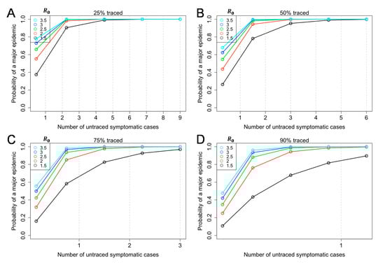Figure 2 shows the probability of a major epidemic given by the number of untraced symptomatic cases and the reproduction number, R among symptomatic cases (Equation (6)). If the success rate of contacts traced and isolated () is high, the probability of a major epidemic may be high even by the time of observing one untraced case. Even if the reproduction number is 1.5, and even if 90% of symptomatic individuals are traced and isolated, the probability of a major epidemic exceeds 80% (Figure 1D).