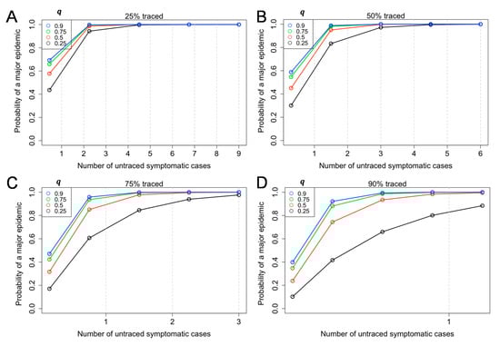Probability of a major epidemic, given the number of untraced symptomatic cases and the relative infectiousness of an asymptomatic individual (). Equation (6) in the main text was used. The probability of a major epidemic was estimated given different rates of success in contact tracing (25% (), 50% (), 75% (), and 90% () for panels A–D) among symptomatic cases. Colored circles and lines classify the relative infectiousness of asymptomatic individuals compared to symptomatic individuals (), which was assumed to vary from 0.25–0.90. The reproduction number among symptomatic cases was assumed as R = 2.5. The asymptomatic ratio was assumed as 40% (i.e., p = 0.6). The number of untraced symptomatic cases is below 1 in Figure 3D.