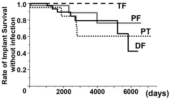 As shown by Table 2, a total of 14 patients (PF, 3 patients; DF, 7 patients; PT, 4 patients) were diagnosed with deep periprosthetic infection and received surgical treatment. The 10-year implant survival rate without infection was 100% (TF), 89% (PF), 79% (DF), and 60% (PT) by the Kaplan–Meier survival curve (Figure 2). Among the infected patients, three died from the underlying tumor. Five patients (36%) were in remission after undergoing one or two one-stage operations; on the other hand, three patients required more than three one-stage surgeries, and another three patients received additional treatment, such as secondary revision, amputation, and musculocutaneous flap. One patient underwent amputation above the knee due to tumor recurrence around the popliteal artery. The patient who underwent PT for giant cell tumor of bone required musculocutaneous flap because of skin and soft-tissue defect after infection. Periprosthetic infection within two years was noted in six patients (one PF, four DFs, and one PT); eight patients had infection after two years (two PFs, three DFs, and three PTs).