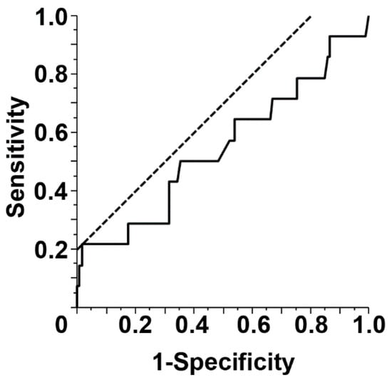 The receiver operating characteristic (ROC) curve for the risk of periprosthetic infection in operating time. The area under the curve (AUC) was 0.54406 (95% CI, −0.0002–0.0087), and the optimal cut-off value was 493 min.