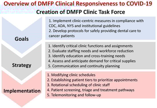 The overview of the DMFP clinic response to COVID-19 is shown schematically in Figure 1. In response to the pandemic, a DMFP clinic task force was created in early March 2020 to implement clinic-centric measures that were in compliance with Centers for Disease Control and Prevention (CDC), the American Dental Association (ADA), NYS and institutional guidelines and develop protocols for safely providing dental care for cancer patients. The taskforce included the department chair, the clinical chief, a general dentist, the lead dental assistant and the clinic administrator. Such a composition of the task force ensured that all administrative and operational needs of the clinic and staff concerns were addressed. Given the relatively fluid nature of the situation, daily virtual meetings of the taskforce were conducted (via WebEx) to monitor the regional situation and to appraise team members of any updates to institutional policies regarding patient care and staff. The goals of the task force and the strategic approach undertaken to implement clinic-centric measures that complemented institutional measures are summarized in Figure 1.
