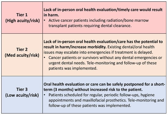 All clinic providers were asked to review their schedules for the months of March and April. Consistent with the framework [] suggested by the Centers for Medicare and Medicaid Services (CMS), a three-tiered classification of patients was developed to modify clinic schedules as shown in Figure 2. Patients with scheduled appointments were immediately contacted and their health status assessed over the phone to determine the urgency of their treatment. The immune status of patients (undergoing active chemo/RT or immunotherapy, recent organ transplant; on immunosuppressive therapy) was also taken into consideration while determining the tier and type of appointment. Patients with appointments for elective dental procedures (e.g., routine follow-up appointments, prosthetic or routine oral hygiene maintenance patients that could wait) that could be safely deferred were rescheduled (on an average of 4–6 weeks from the initial appointment date). Patients were notified of their rescheduled appointments by the clinic receptionist along with the communication regarding the availability of all dentists and specialists for telephone consults.