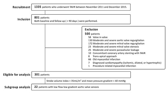We conducted a single-center retrospective observational study. A total of 1335 patients who underwent TAVR at the Cedars-Sinai Medical Center from November 2011 to December 2015 were reviewed. Aspirin was initiated at the timing of TAVR and continued at least one year. Of those patients, 801 patients had undergone comprehensive transthoracic echocardiography (TTE) at baseline and follow-up (≥90 days from TAVR). From these patients, we excluded 500 participants who met the following exclusion criteria: valve in valve TAVR (n = 58); moderate and severe aortic regurgitation (n = 130); moderate and severe mitral regurgitation (n = 172); moderate and severe mitral stenosis (n = 23); moderate and severe paravalvular leakage (n = 25); concomitant coronary artery stenting with TAVR (n = 10); transapical approach (n = 8); old myocardial infarction (n = 66); diagnosed ischemic, dilated, or hypertrophic cardiomyopathy (n = 7); and procedure-related myocardial infarction (n = 1). This left 301 patients were eligible for our analysis (Figure 1).