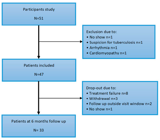 The baseline characteristics are described in Table 1. A total of fifty one subjects participated in the study. Four patients were excluded at baseline for various reasons (no show, suspicion of tuberculosis or cardiac disease de novo, arrhythmia and cardiomyopathy, depicted in Figure 2). The mean age of the patients was 57 (±11) years, of which 68% were female. Median RA disease duration was 5 (2–19) years and disease activity was moderate–high, with a mean DAS28 score of 4.44 (±1.23). Overall, the patient’s mobility was moderately impaired with a median HAQ score of 1.25 (0.75–1.50). One patient had a confirmed vascular event (ischemic CVA) in the history.